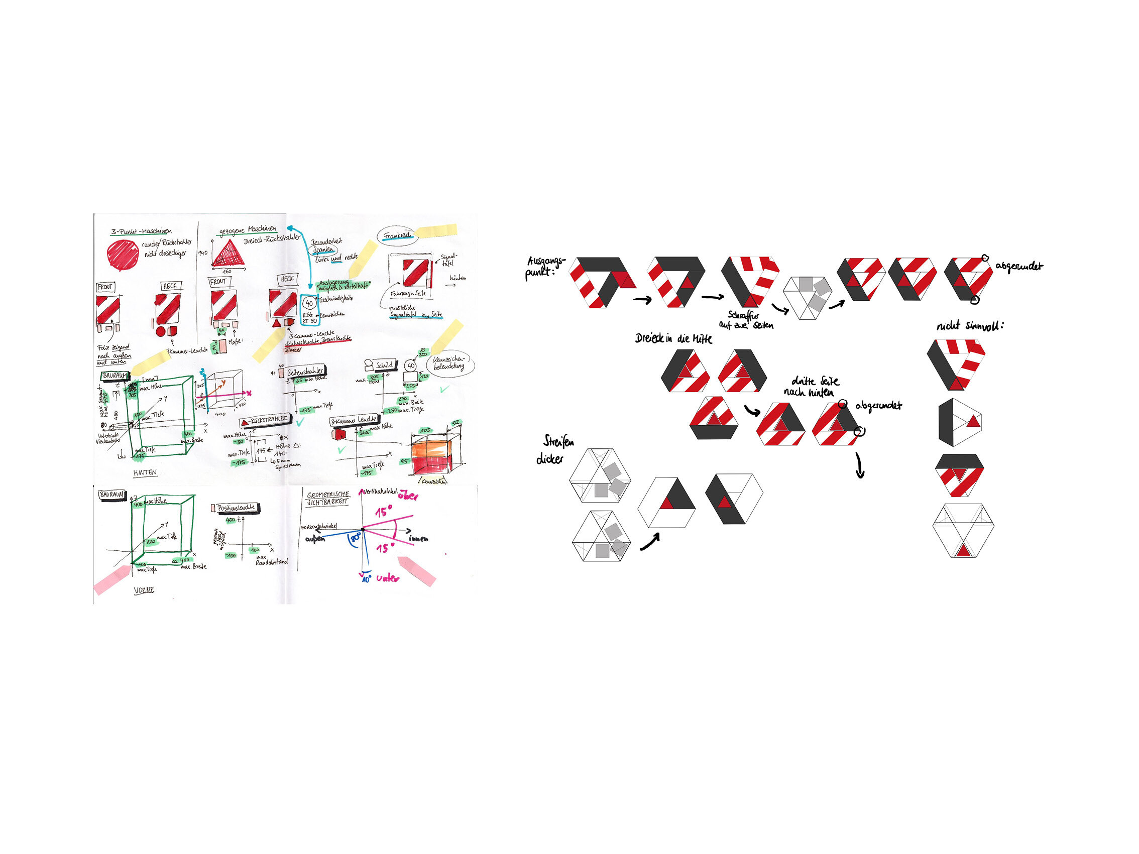 In the next step, we worked a lot on the right shape by folding paper to create surfaces for the reflective foil, lighting unit, reflector components and number or speed sign. We stopped at the shape of the equilateral triangle, as this can already be found in the reflector triangle and also in road traffic with a signalling effect.