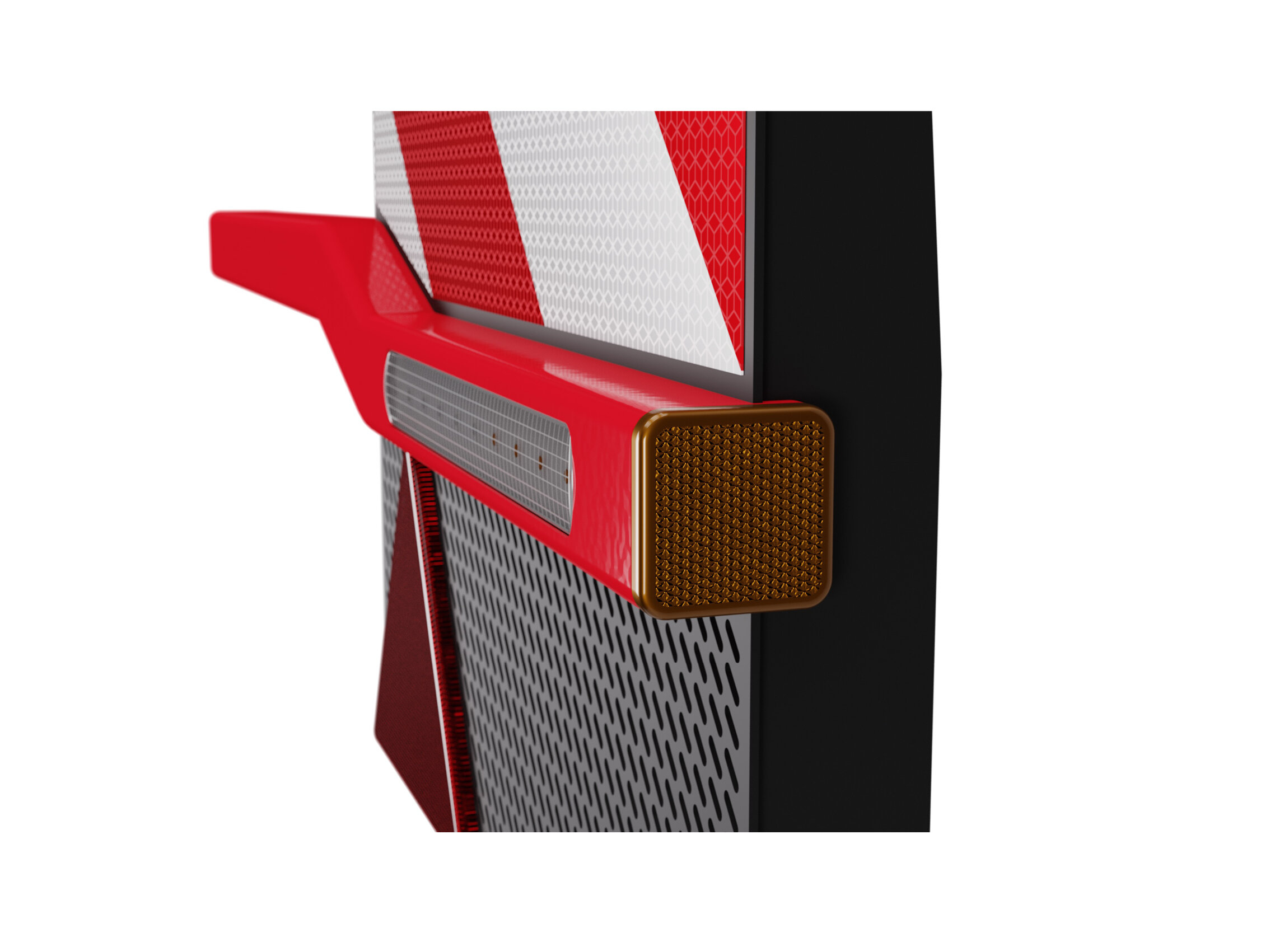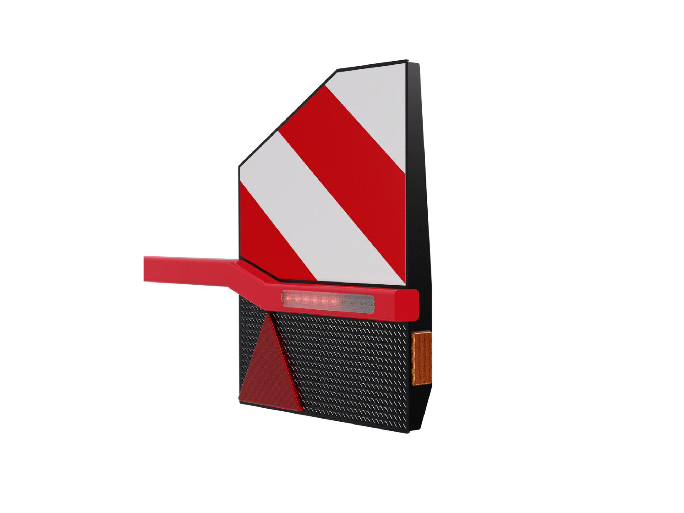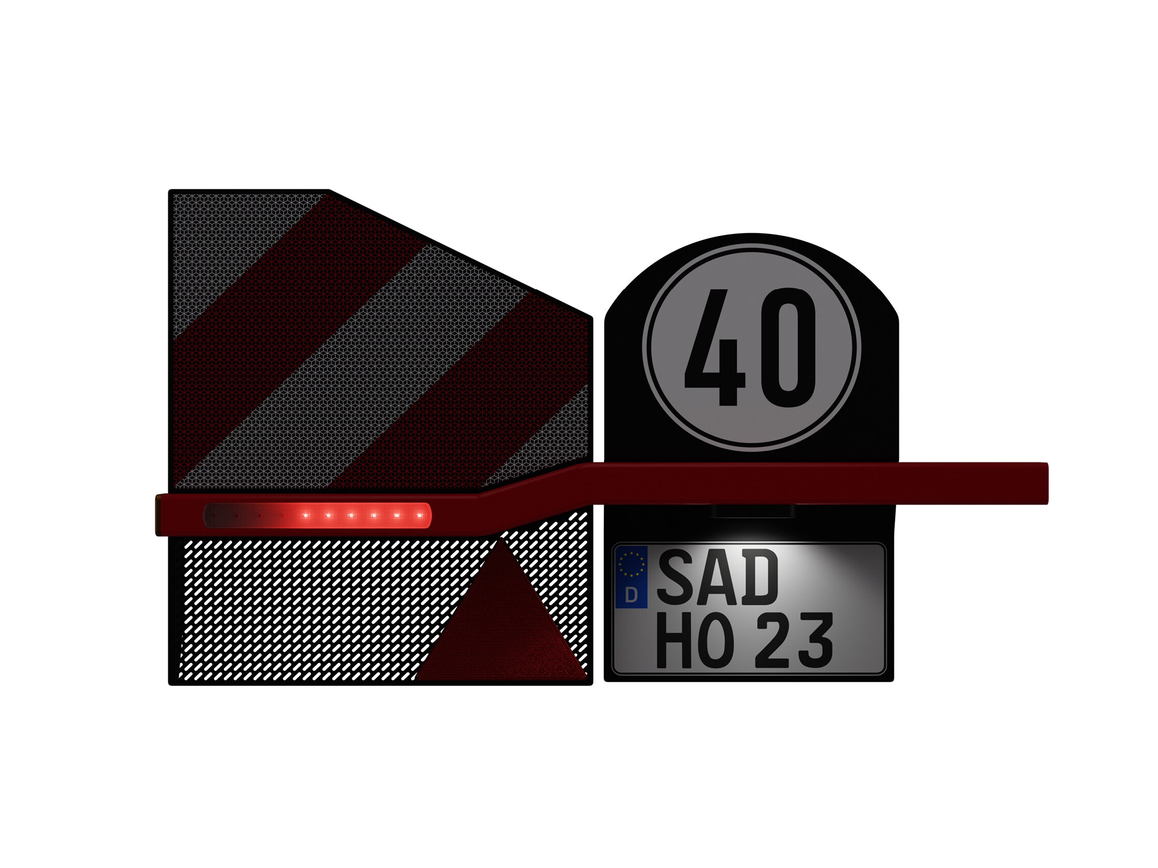 Tail, btake and indicator lights are elegantly inserted into a recess in the profile. The strip-shaped all-in-one solution, which is available as a prefabricated part, ensures a simple and stylish appearance. It also provides the opportunity to attach the side reflector to the open end of the profile. Normally, the cables would come out here, which go to the three chamber lamp mounted on the outside. The side reflector thus forms a clever end to the profile. To ensure adaptability to different legal requirements, the licence plate holder and speed sign are designed as independent modules. They can be mounted independently of the lighting and signalling unit according to need and requirement. Deliberate care has been taken to ensure that the metal plates that are attached to the profile are of a different colour. This makes the elegantly curved red profile stand out more.