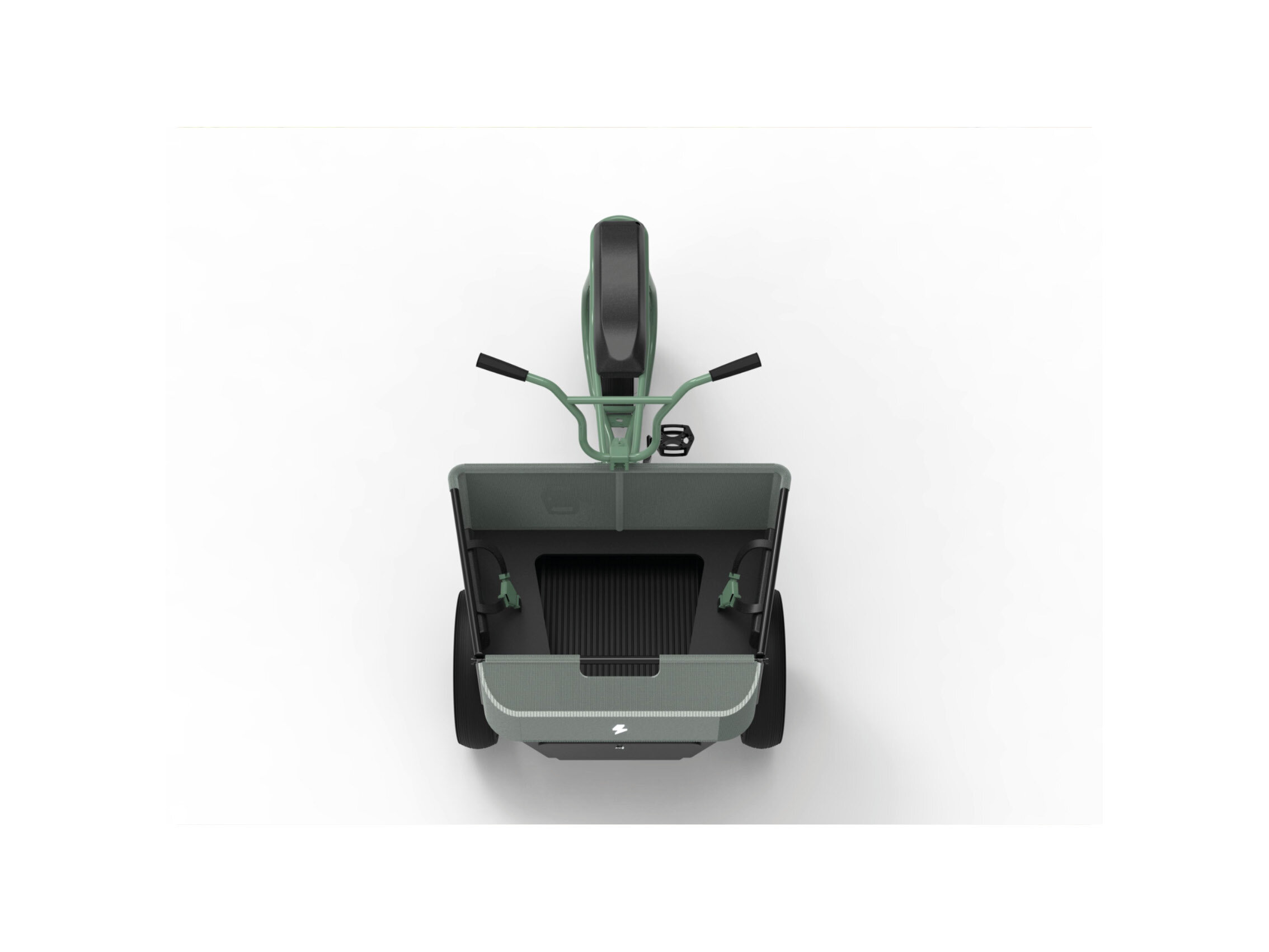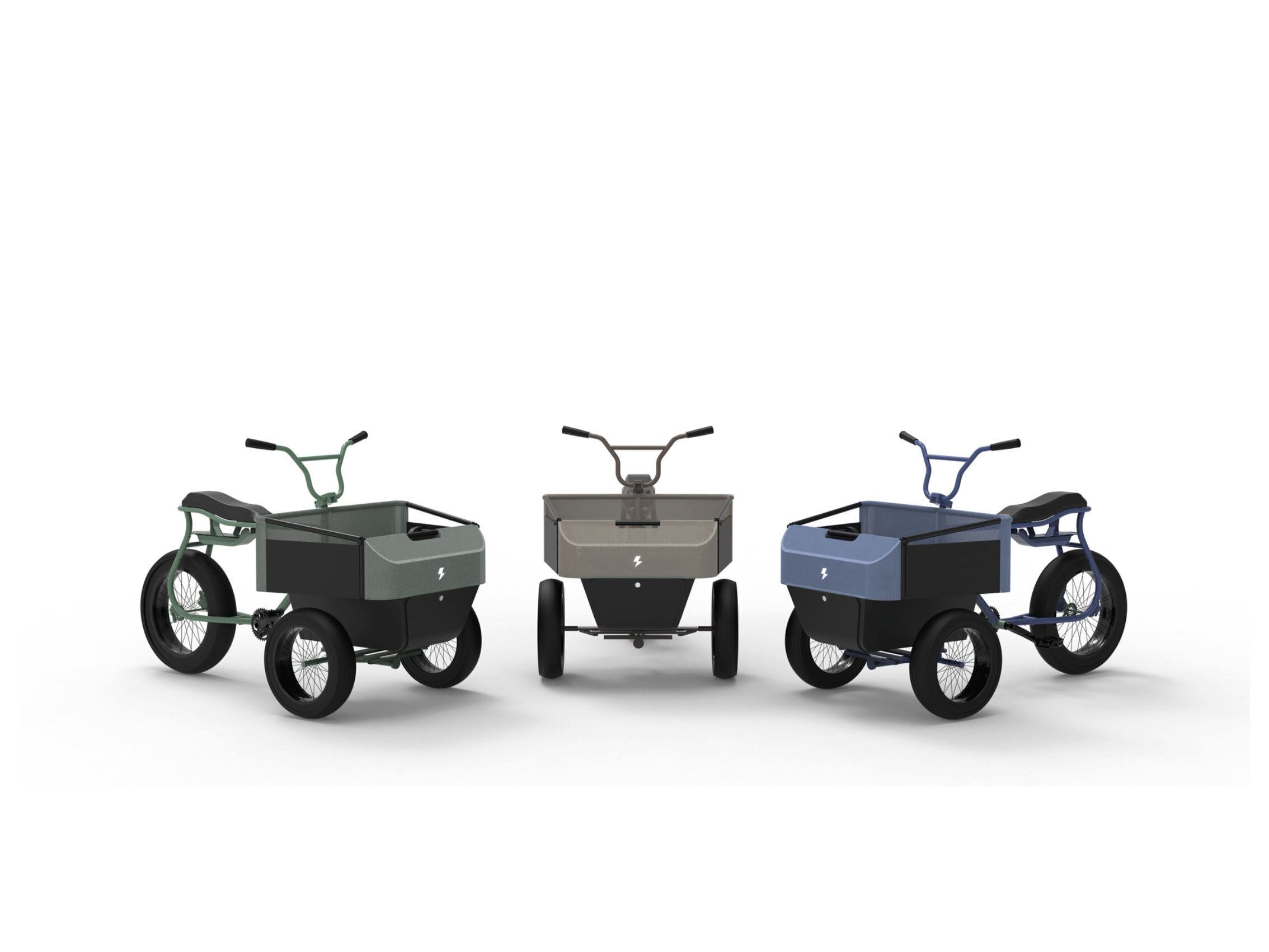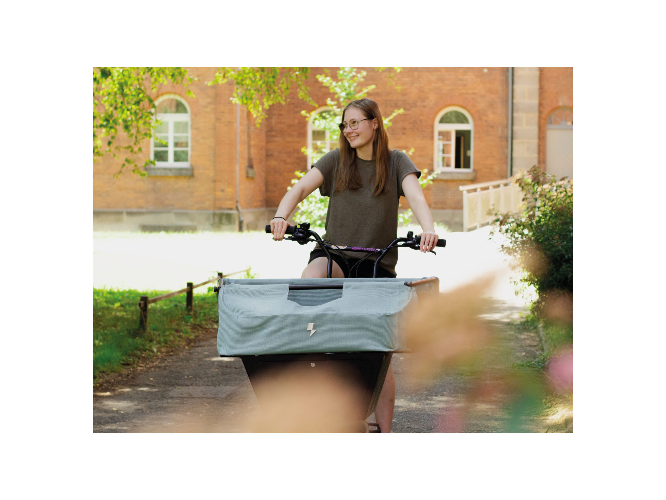 The front section consists of a sturdy, lockable and theft-proof plastic lower box on the one hand, and an upward-opening volume on the other. This volume widens over the two front wheels, providing splash protection in wet weather. The mesh, a flexible and air-permeable fabric, contrasts with the closed lower box and adds lightness to the design. The mesh is used at the front and rear. Metal tubes stabilise the mesh and create a formal reference to the bicycle frame. The front of the structure can be opened with a simple hand movement, making it easier to load goods and/or allow up to two children to get in. The aforementioned widening to cover the wheels forms two benches for transporting children, which are upholstered and each equipped with a 3-point seat belt. A recess in the loading area gives the children enough legroom.