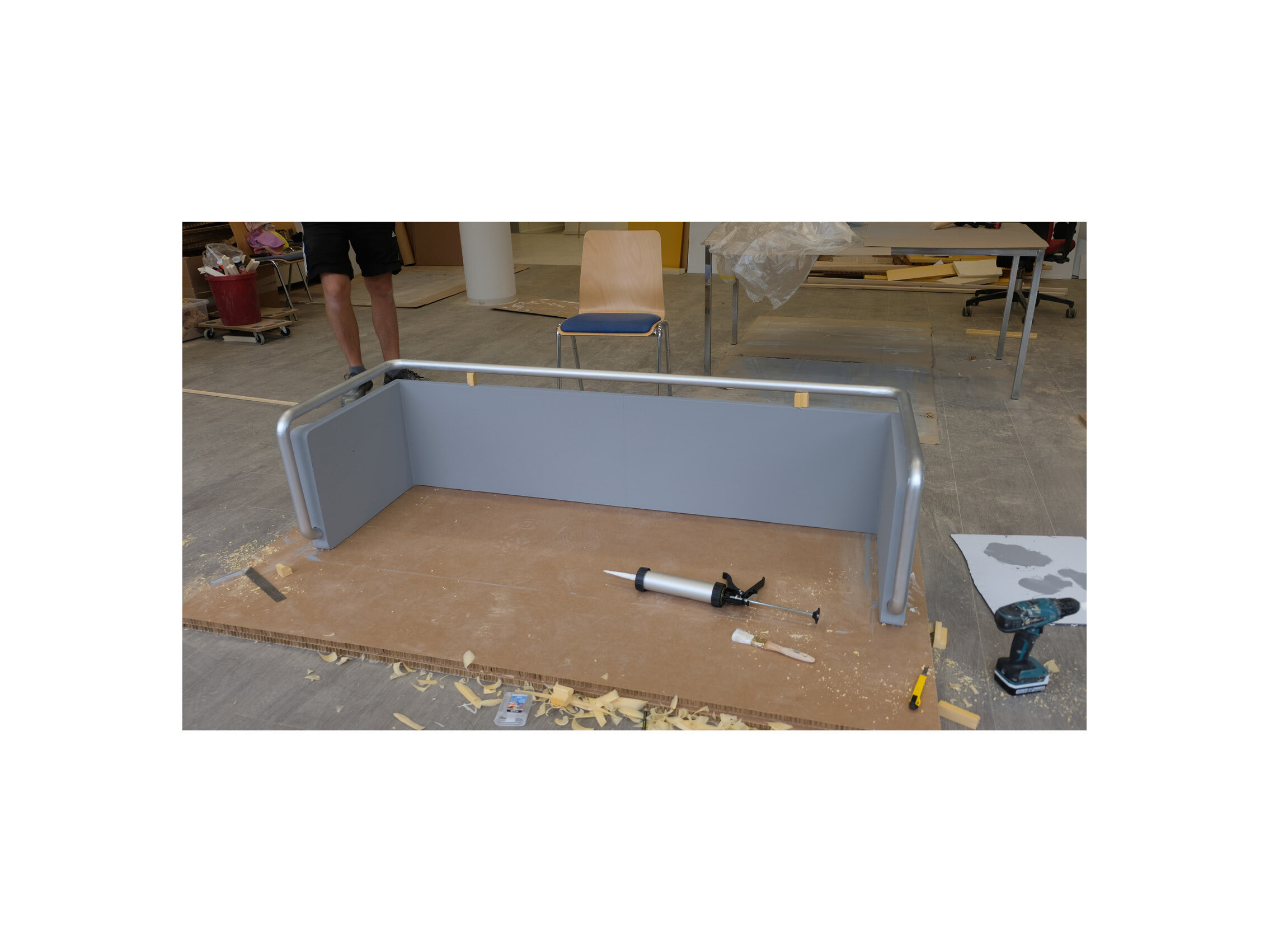 The aim of the practical semester was to build a life-size model of the multifunctional area of the Regensburg light rail system based on a preliminary design study of the Regensburg light rail system. The multifunctional area is part of the first or last carriage of the railway and offers its passengers with mobility aids, such as pushchairs, wheelchairs and rollators, a barrier-free mobility solution. By building the area, using given dimensions and CAD files, the usability of the railway was to be tested and any need for changes to the design identified and implemented. The most important requirement for the model was a modular structure in order to be able to guarantee transport to another room. It was also necessary to use building materials that were available on the DIY market, which is why creativity and the ability to improvise were required in some places. After completion, the passenger compartment was tested by the Inclusion Advisory Board and problem areas were documented. The model was presented to the public at a light rail exhibition in October 2023 and citizens were able to walk through it.