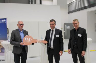 The ecumenical blessing of the building was performed by Dean Josef K Geismar and Pastor Karolin Gerleigner. Afterwards, architect Robert Brunner symbolically presented the key to the laboratory hall to the First Mayor of the town of Plattling. He finally places it in the hands of the DIT president as the actual user of the building. The MoMo was thus opened and went straight into working mode. With a guided tour of the research rooms and laboratories for the guests.