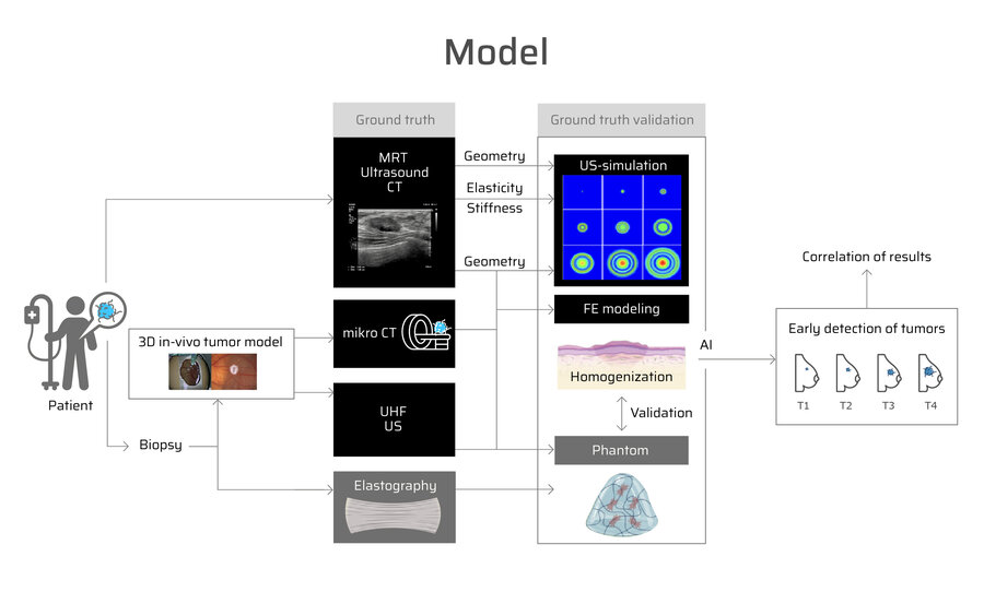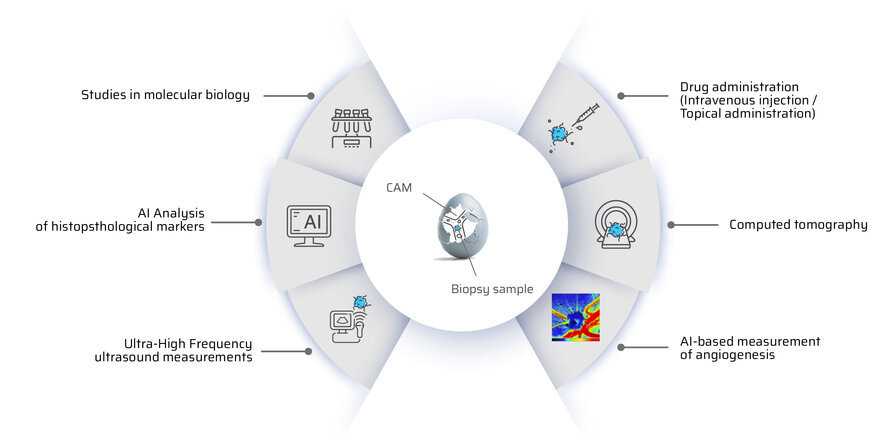 A patient's tumour is diagnosed using computed tomography (CT), ultrasound (US) and magnetic resonance imaging (MRI). A biopsy provides tumour tissue, which is cultivated on the chorioallantoic membrane (CAM). During growth, regular CT, US and elastography examinations are performed to analyse tissue stiffness, volume changes and the response to therapy.