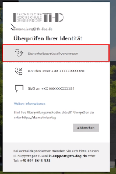 The backup variant "MFA via telephony (SMS)" is recommended if the USB security key has been lost or the "Microsoft Authenticator" app cannot be used due to the loss or defect of the smartphone.