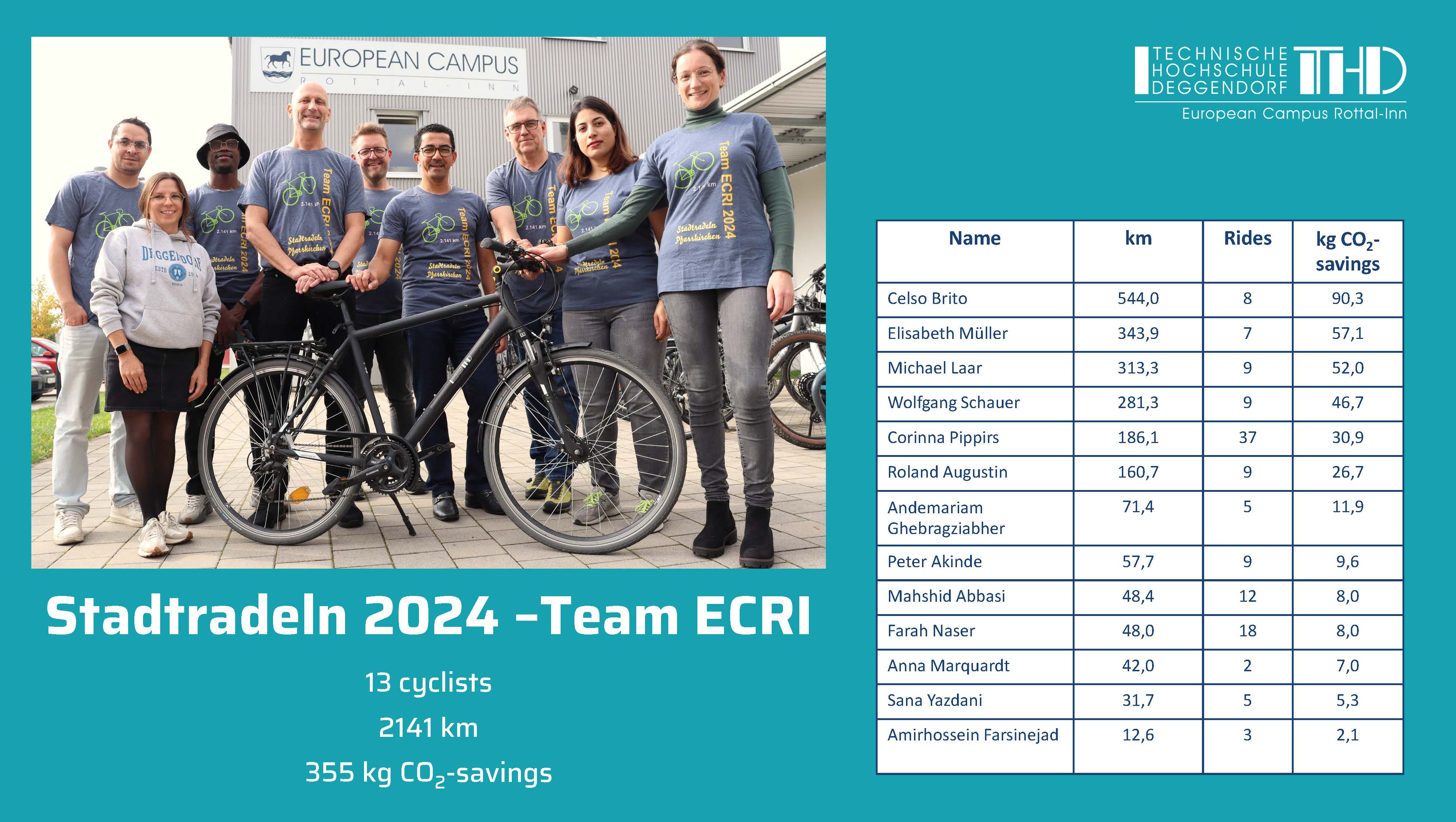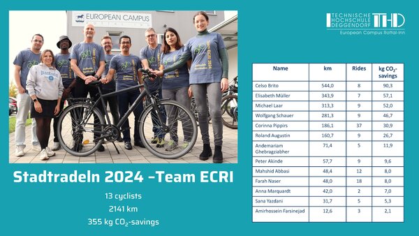 In diesem Jahr beteiligte sich ein Team in Deggendorf und ein Team des European Campus Rottal-Inn an der Stadtradeln-Kampagne. Vom Nachhaltigkeitsbeauftragten Prof. Dr. Michael Laar wurden Preise für die drei Radlerinnen und Radler mit den meisten Kilometern in Pfarrkirchen vergeben. Zudem bekam das gesamte ECRI-Team T-Shirts für die Teilnahme. Das Team ECRI 2024:
