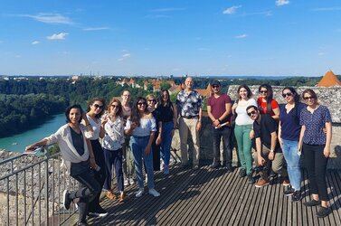 Danach ging es für die Gruppe weiter nach Burghausen. Dort tauchten sie auf der längsten Burg der Welt in die mittelalterliche Baukunst ein. Neben den Gebäuden der Burg besuchten die Studierenden auch das Museum mit Rennaissancegemälden der bayerischen Staatsgalerie. Dort diskutierten sie unter anderem die Entwicklung von Perspektiven in Gemälden seit der Renaissance bis heute.