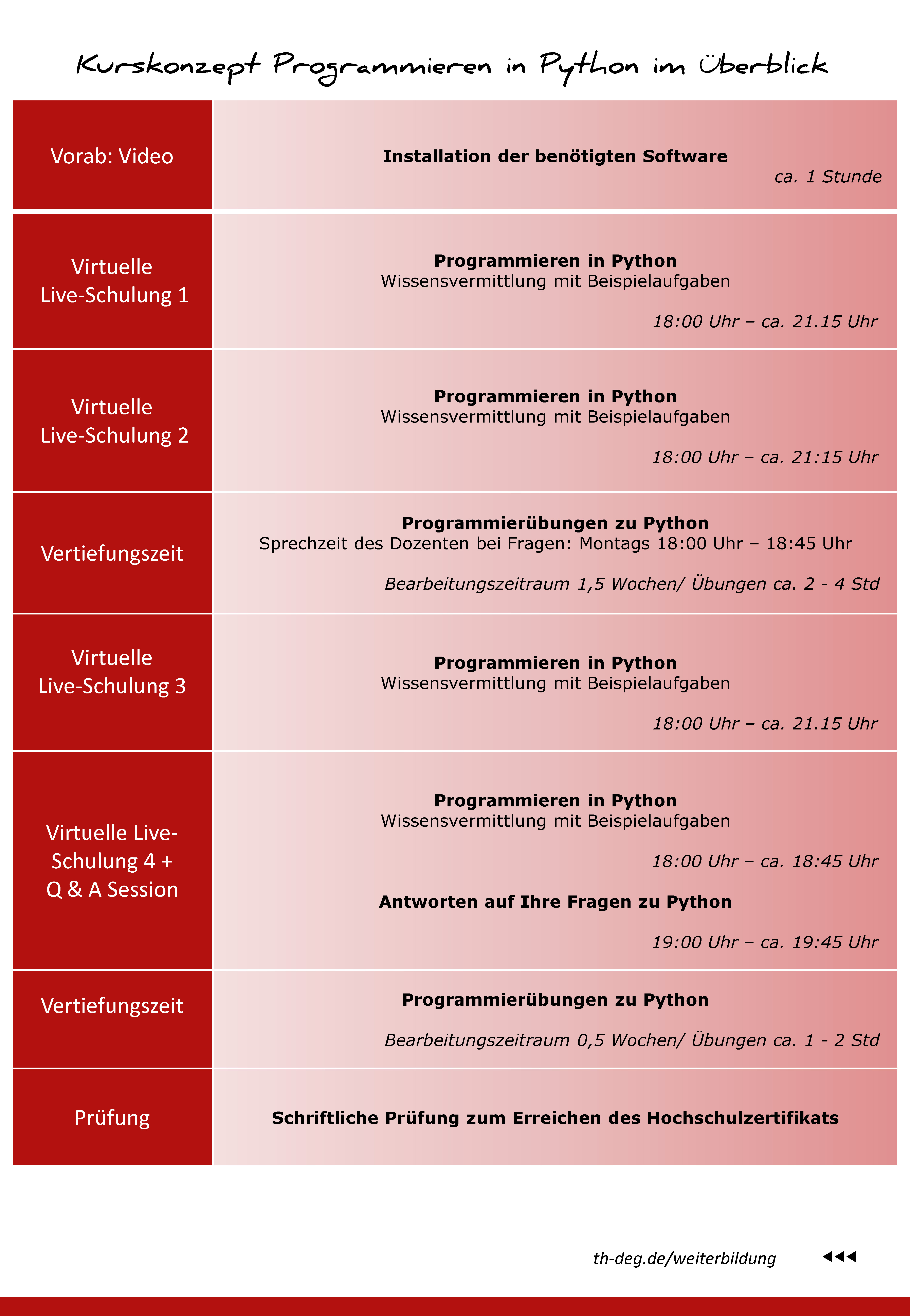 Um Interessierten die Möglichkeit zu geben, sich in diesem Bereich zu qualifizieren, bieten wir den Hochschulzertifikatskurs Programmieren in Python für Programmierneulinge an.