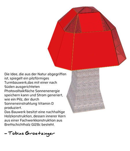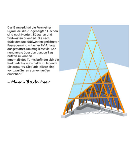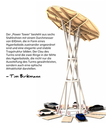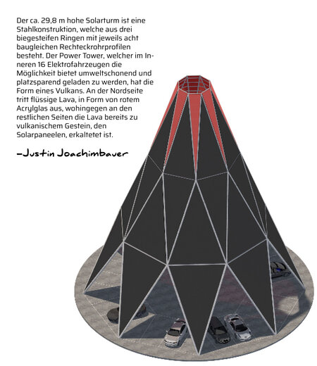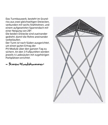 Entwurf, Konstruktion, Bemessung und Kalkulation einer turmartigen Photovoltaikanlage mit Ladestation für Parkflächen in Gewerbegebieten. Der Anteil der Elektroautos am Verkehr und damit der Bedarf an Ladestationen wächst. Elektromobilität steht für Innovation und Umweltbewusstsein. Grundidee der Aufgabenstellung ist es, mit dem Bau von weithin sichtbaren Ladestationen mit PV-Anlagen, Handelsketten von diesem Image profitieren zu lassen und deren elektromobile Kunden zu versorgen. Aufgabe der Projektarbeit sind Entwurf, Konstruktion, Bemessung und Kalkulation eines solchen Bauwerks. Im Einzelnen sind dabei folgende Auflagen und Randbedingungen zu erfüllen:
