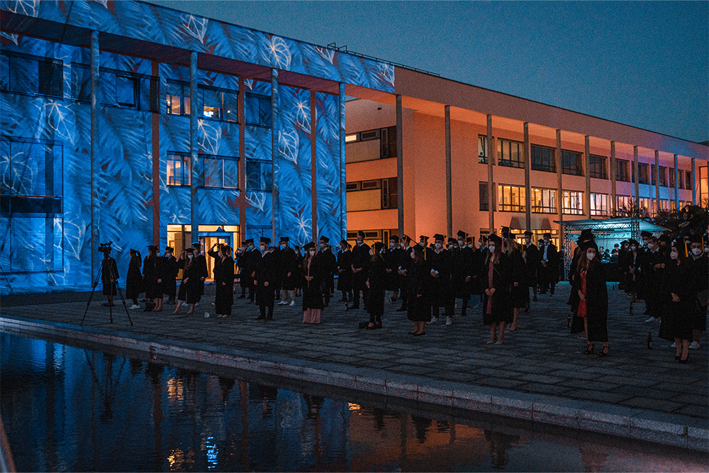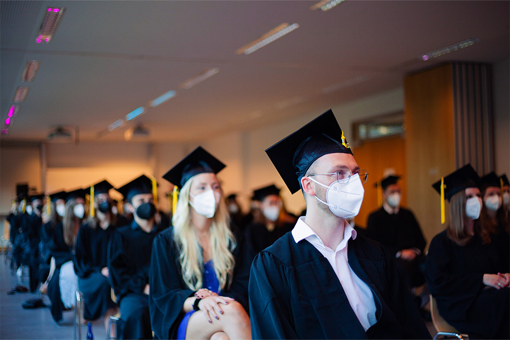 Seit Beginn der Planung war die Pandemie ein maßgeblicher Faktor, der die Konzeption stetig beeinflusst hat. Um definitiv alle geltenden Regelungen im Sommer 2021 einhalten zu können, wurde das Event frühzeitig als hybride Open-Air Veranstaltung entwickelt und auf drei Eventtage verteilt. Dabei wurden die Absolvierenden nach Fakultäten und Studiengänge geordnet, zu einem der drei Eventtage eingeladen. Der Ablauf und das gesamte Rahmenprogramm der Veranstaltung war an allen drei Eventtagen identisch. Am Präsenz-Event konnten nur die Absolvierenden selbst teilnehmen, alle Angehörigen und Freunde hatten die Möglichkeit die Graduation virtuell live zu verfolgen.
