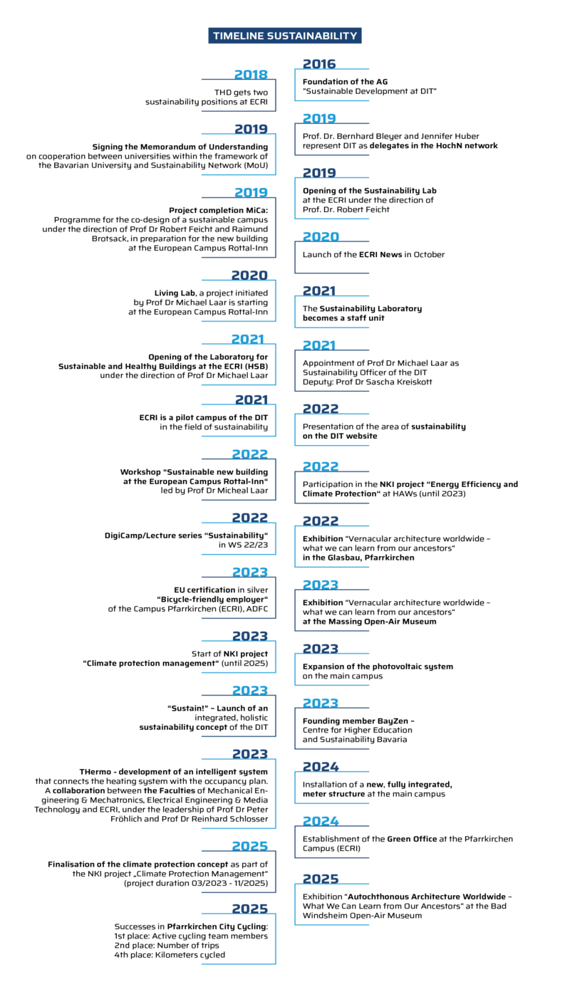 In 2016, DIT founded the Sustainable Development WG and thus formally recorded activities and efforts around the topic of sustainability for the first time. In 2021, the university appointed Prof. Dr. Michael Laar as sustainability officer and officially anchored the topic in the university structure. Since October 2021, Michael Laar has been working with representatives from eight German higher education institutions to develop practical intervention strategies and individual measures for saving energy. These are to be explicitly aimed at universities of applied sciences.